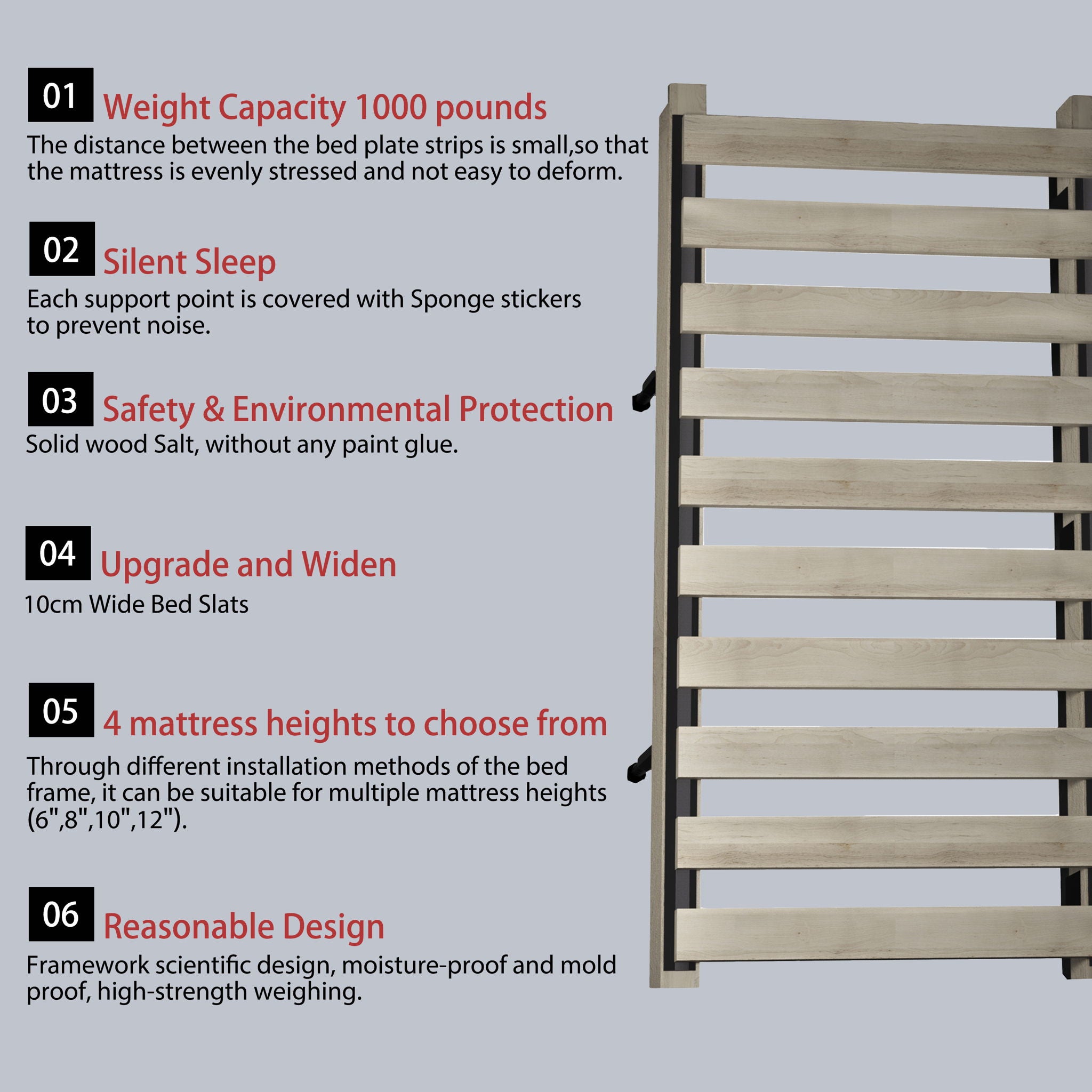 - Multiple heights of mattresses are available for selection: By installing the bed frame in different ways, it can adapt to different mattress heights (6 inches, 8 inches, 10 inches, 12 inches).