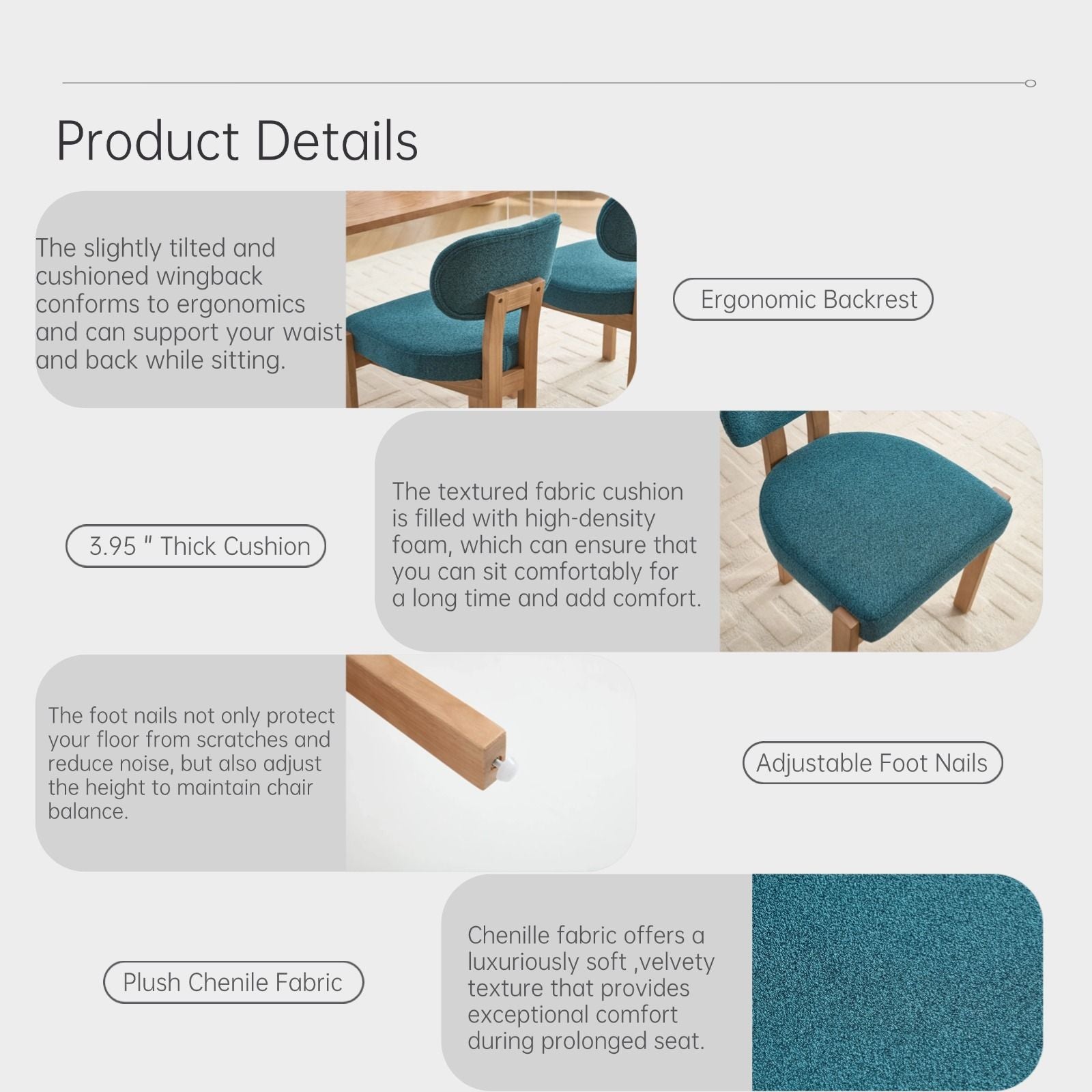 • Adjustable Foot Nails: Prevents floor scratches and maintains chair stability on uneven surfaces