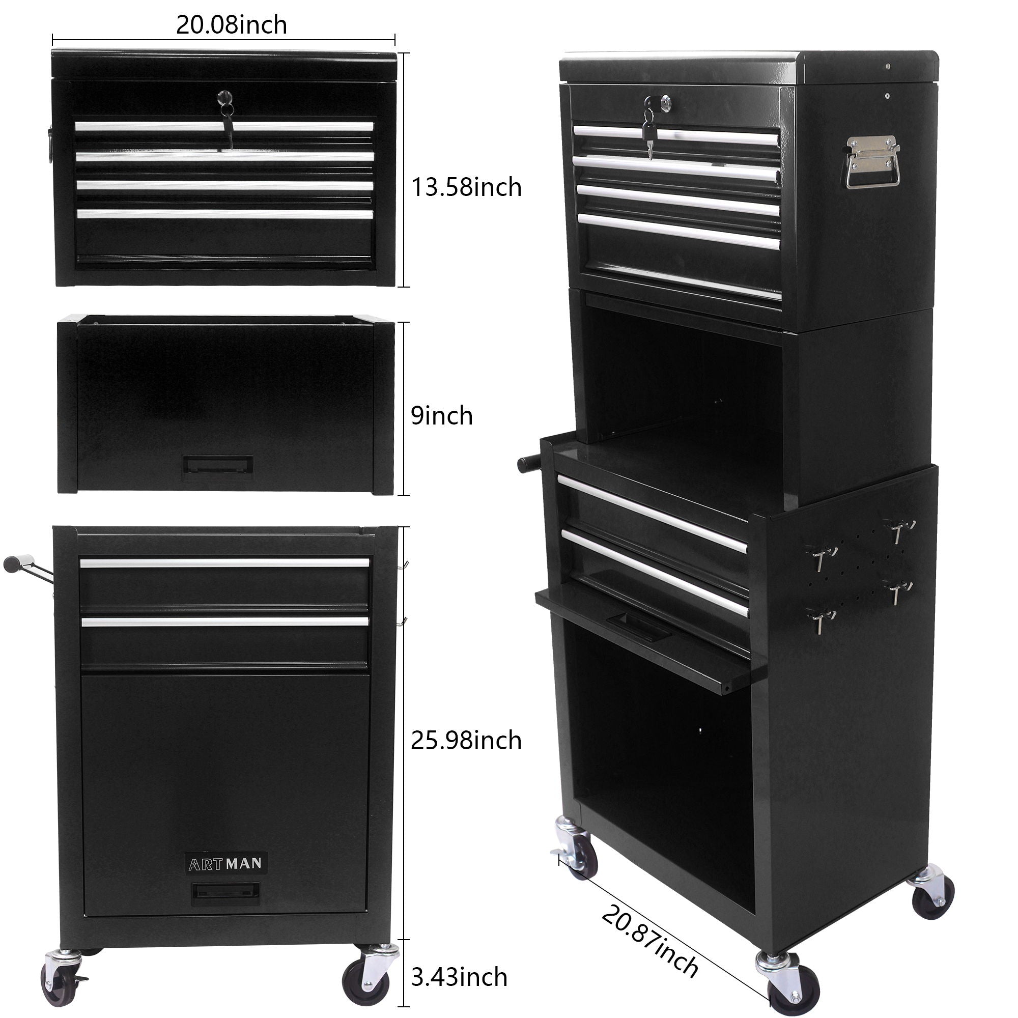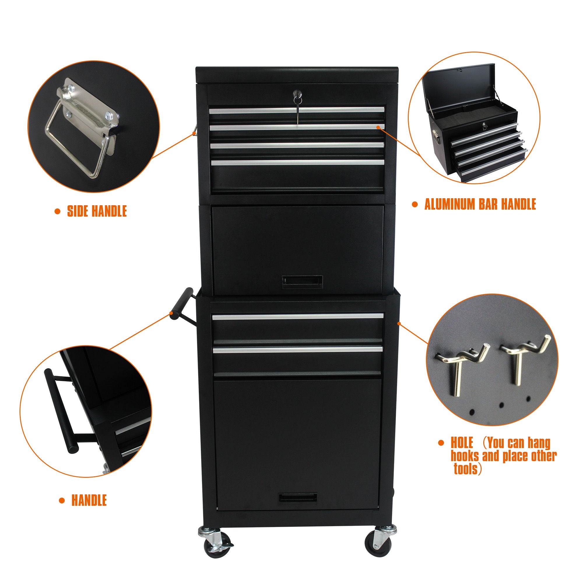 6 Drawer Lockable Tool Cabinet On Wheels Steel Rolling Tool Chest With Detachable Toolbox, 2 In 1 Garage Workshop Storage Organizer With 4 Universal Casters - Black
