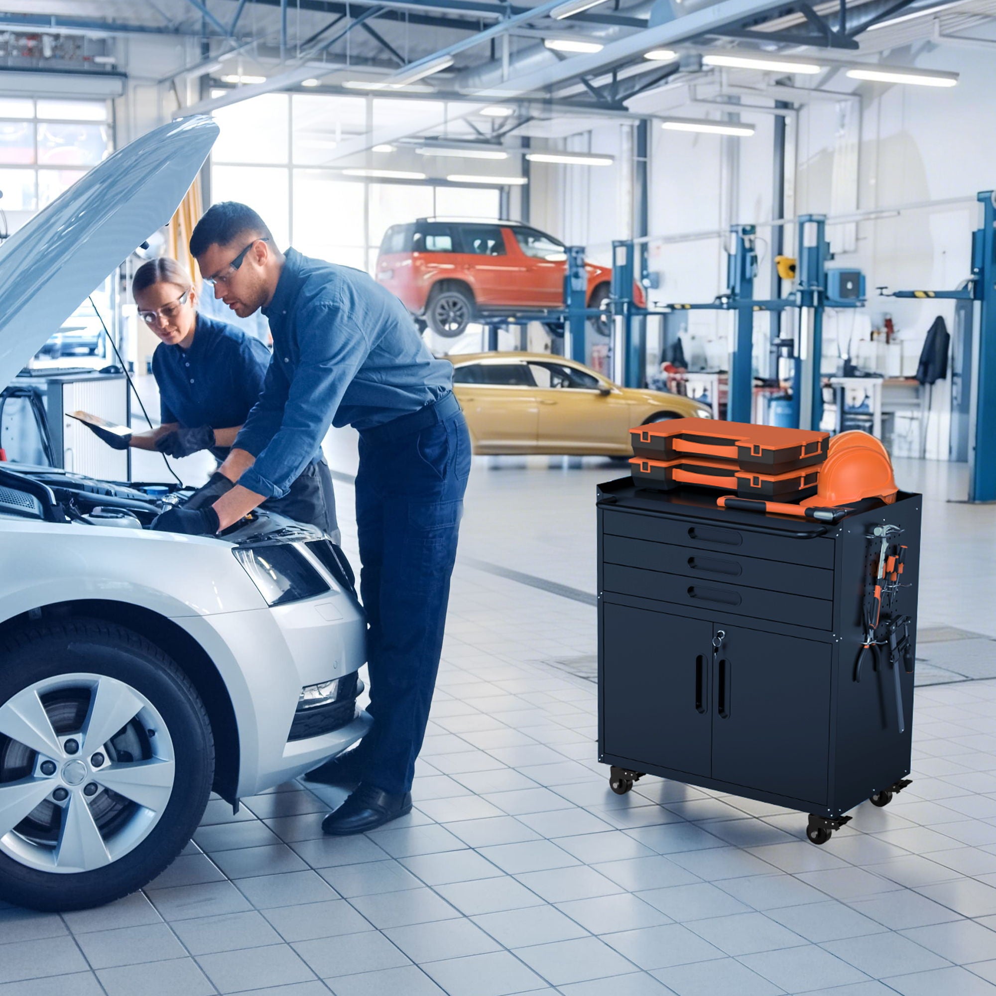 - SECURE & VERSATILE STORAGE: Three smooth drawers and lockable doors offer protected space for tools and supplies, plus an adjustable shelf for customizable layout.