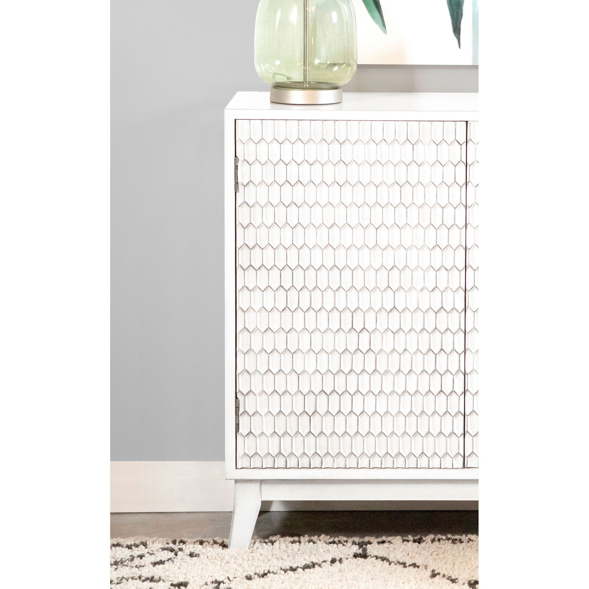 - Sculpted Geometric Doors: Raised honeycomb pattern adds textured visual interest and architectural detail