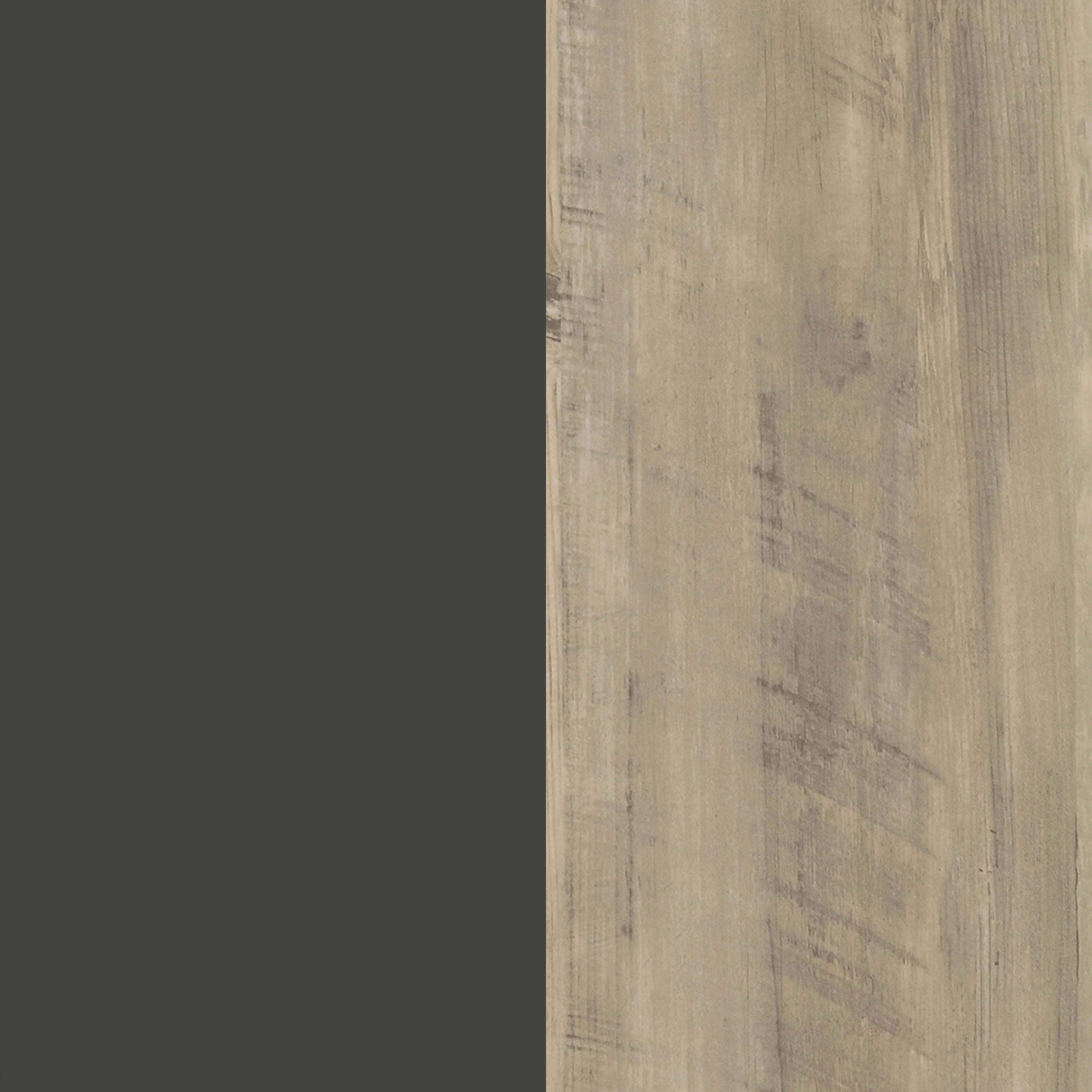 • Contrasting antique gray door fronts with pine finish add visual depth