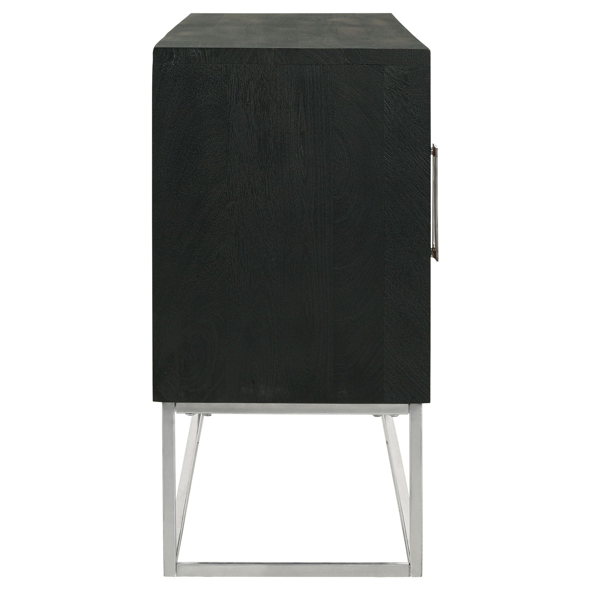 - Walnut wood front panels create rich texture and depth against the clean black base