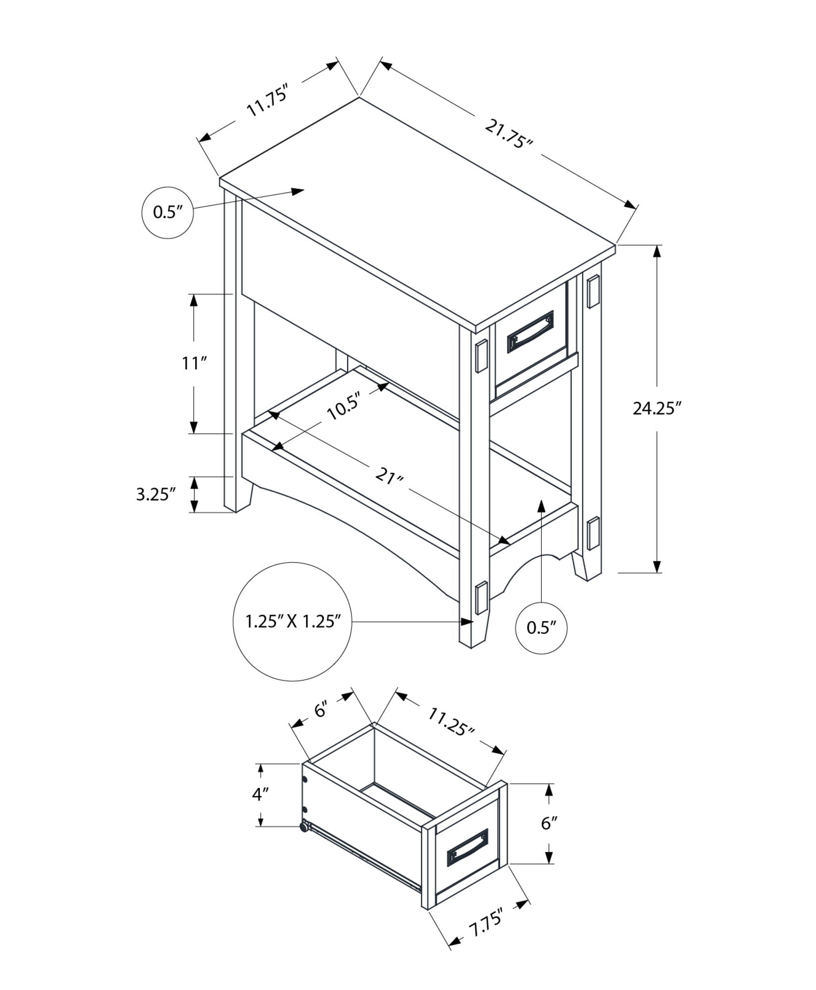 - Compact Dimensions: The table measures 11.75 inches in width, 21.75 inches in length, and 24.25 inches in height, fitting perfectly in compact spaces while providing functional storage.