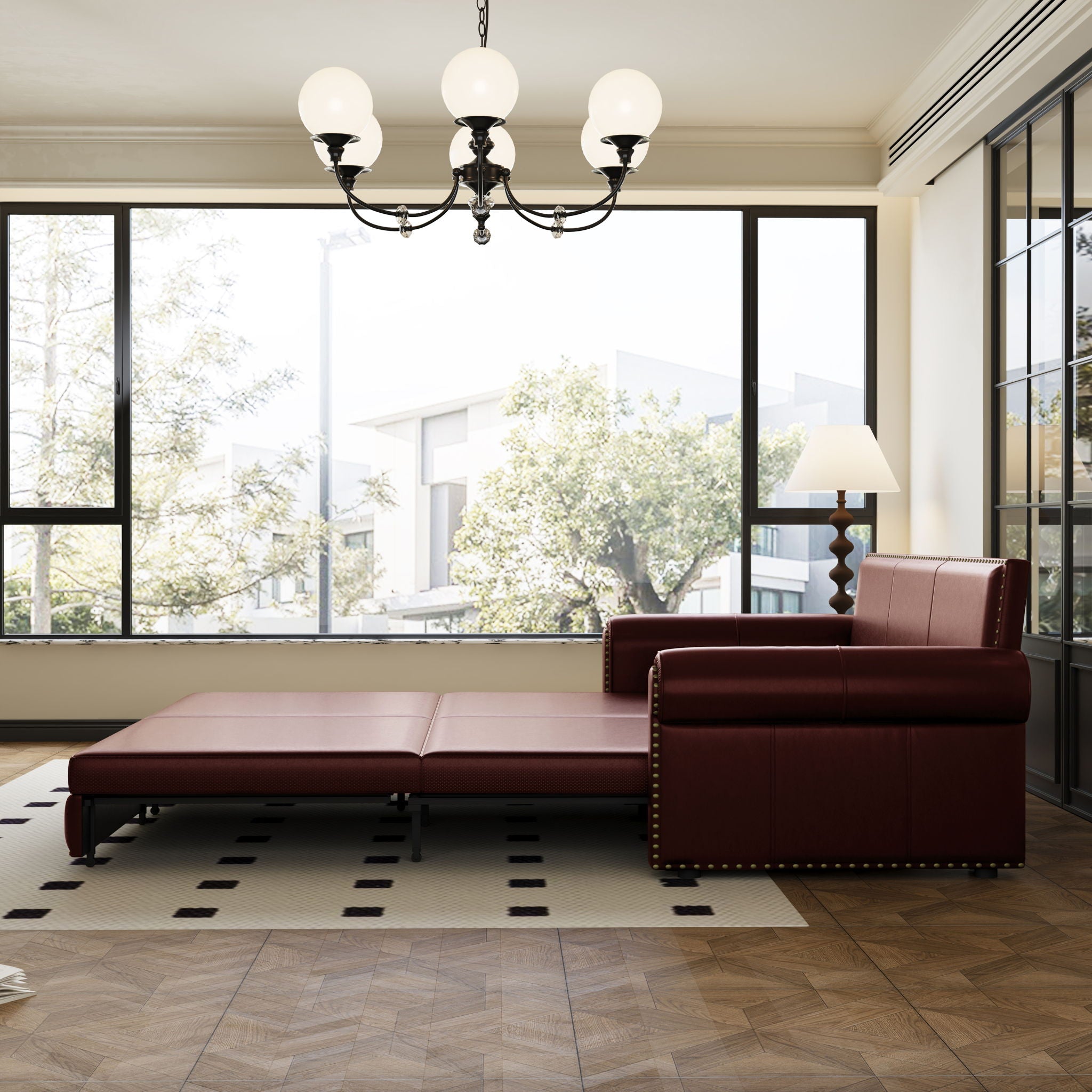 Pull Out Sofa Bed, 3 In 1 Convertible Sleeper Sofa With Nailhead Trim & Rolled Arm, Multi Functional Sofa Bed For Living Room, Bedroom, Apartment, Office - Burgundy