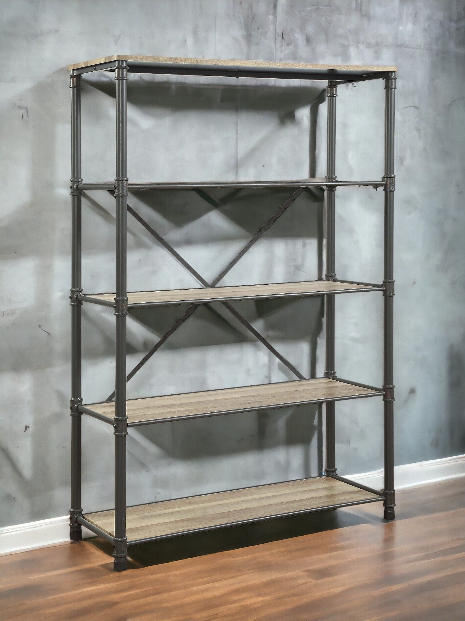 • Industrial Design: This bookshelf combines industrial charm with functional design, featuring a rectangular shape with four open compartments and five wooden shelves, ideal for displaying books and decor.