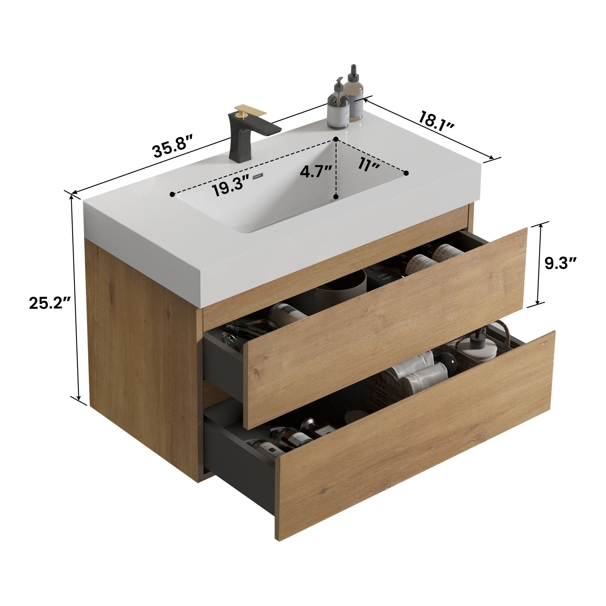 Alice - U042-Alice36-106 Bathroom Vanity With Black Sink, Large Storage Wall Mounted Floating Bathroom Vanity For Modern Bathroom, One-Piece Black Sink Basin Without Drain - Oak / White