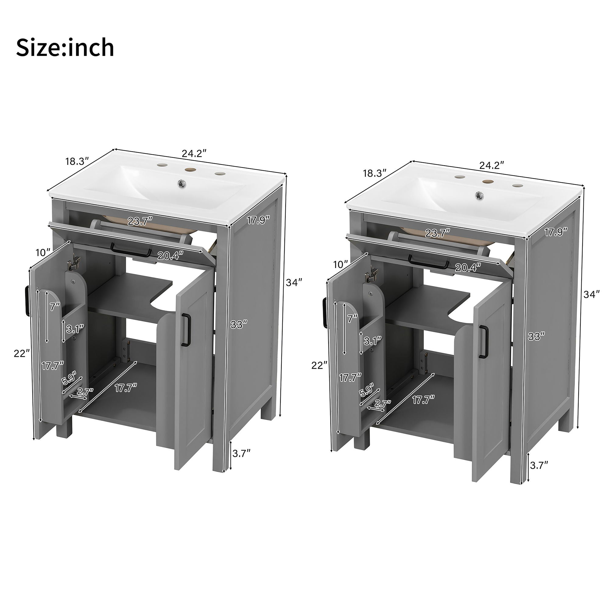 Bathroom Vanity With Sink, Soft Close Doors, Flip Drawer, Double Layer Door Shelves - Gray