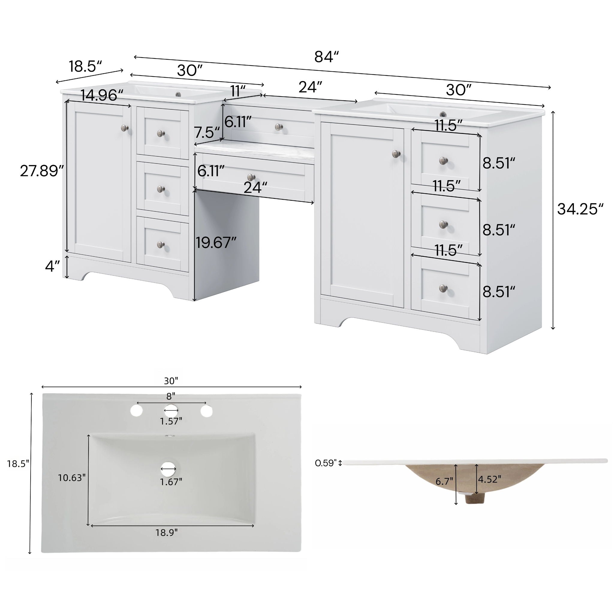 Double Sink Bathroom Vanity With 2 Sinks, 6 Drawers, Soft Close Design - White
