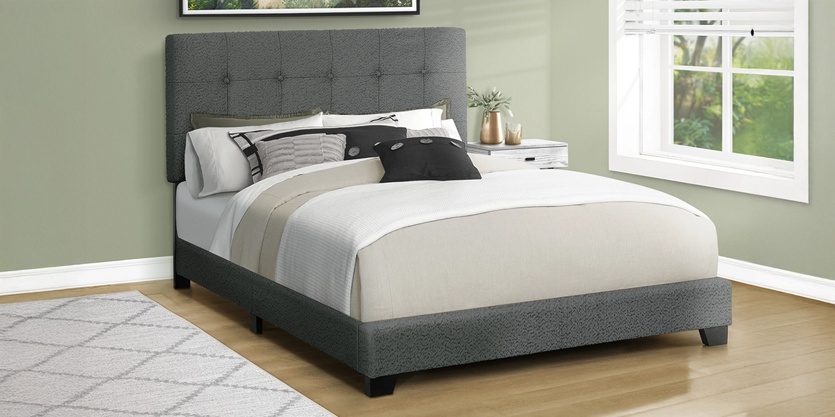 Elevate your bedroom with the timeless elegance of the Queen Size Transitional Upholstered Bed. Wrapped in a trendy dark grey boucle fabric, this bed frame brings texture, warmth, and sophistication to any transitional décor. Designed with clean lines and sturdy black block feet, it effortlessly blends modern style with classic appeal.