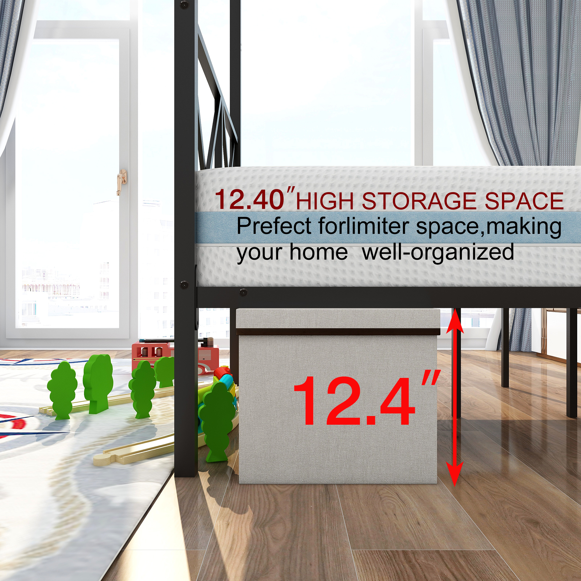 Equipped with metal slats, the bed supports your mattress directly, ensuring even weight distribution and eliminating the need for a box spring.