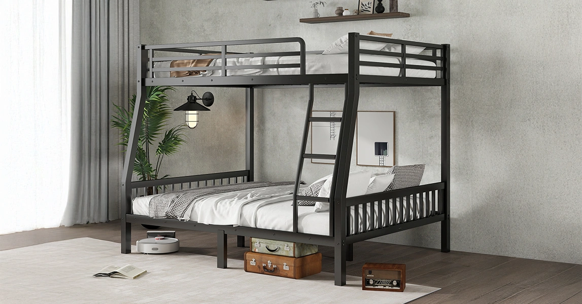 Designed to meet your needs for practicality and durability, this full XL over queen bunk bed is ideal for growing families or multi-purpose rooms. The built-in ladder, reinforced metal tube slat system, and easy-access guardrails provide a solid structure that stands up to years of use — from childhood sleepovers to adult guests.