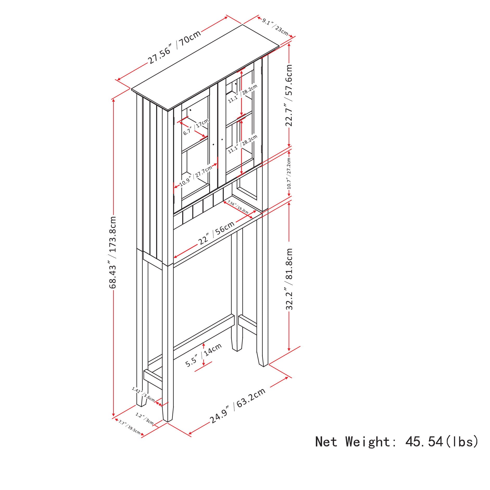 27.6"W x 9.1"D x 68.4"H - 45.5 lb