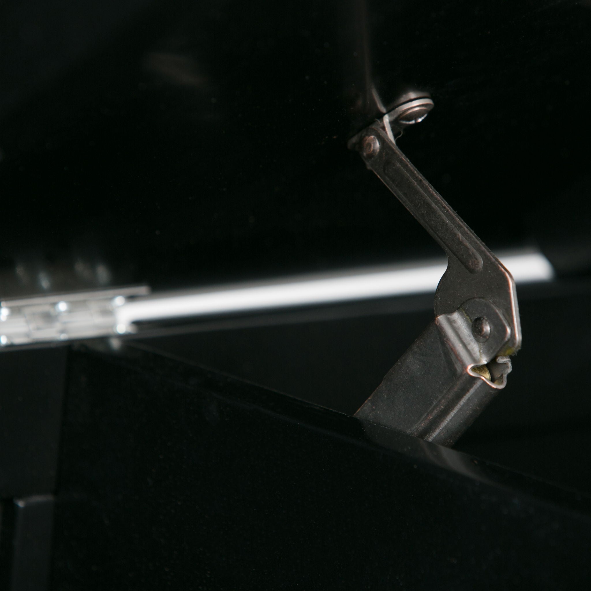 - Lift up bench lid opens using safety hinges to expose 2 large internal storage compartments