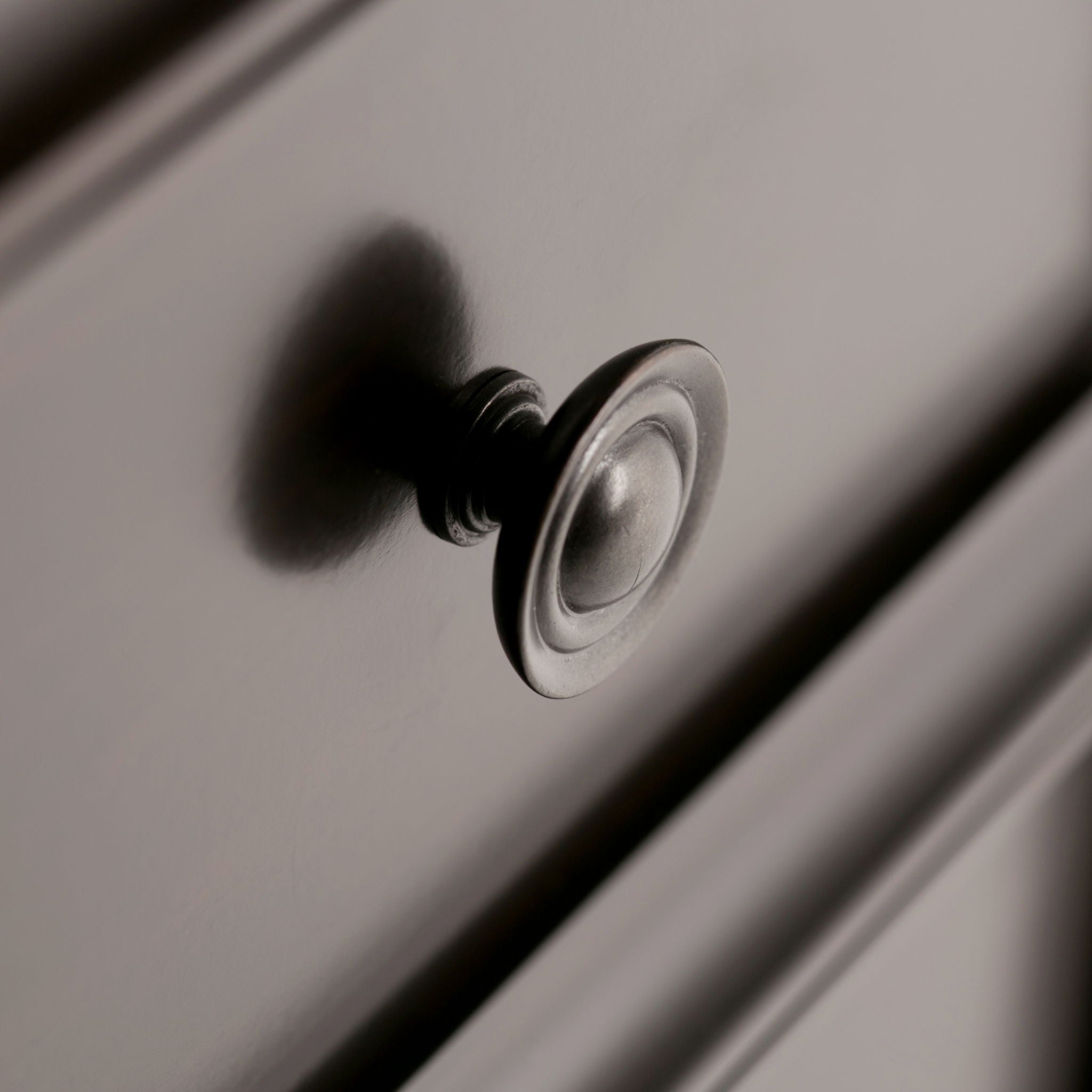 • Transitional style includes tapered legs, molded crown edged table top, and antique pewter round decorative knobs