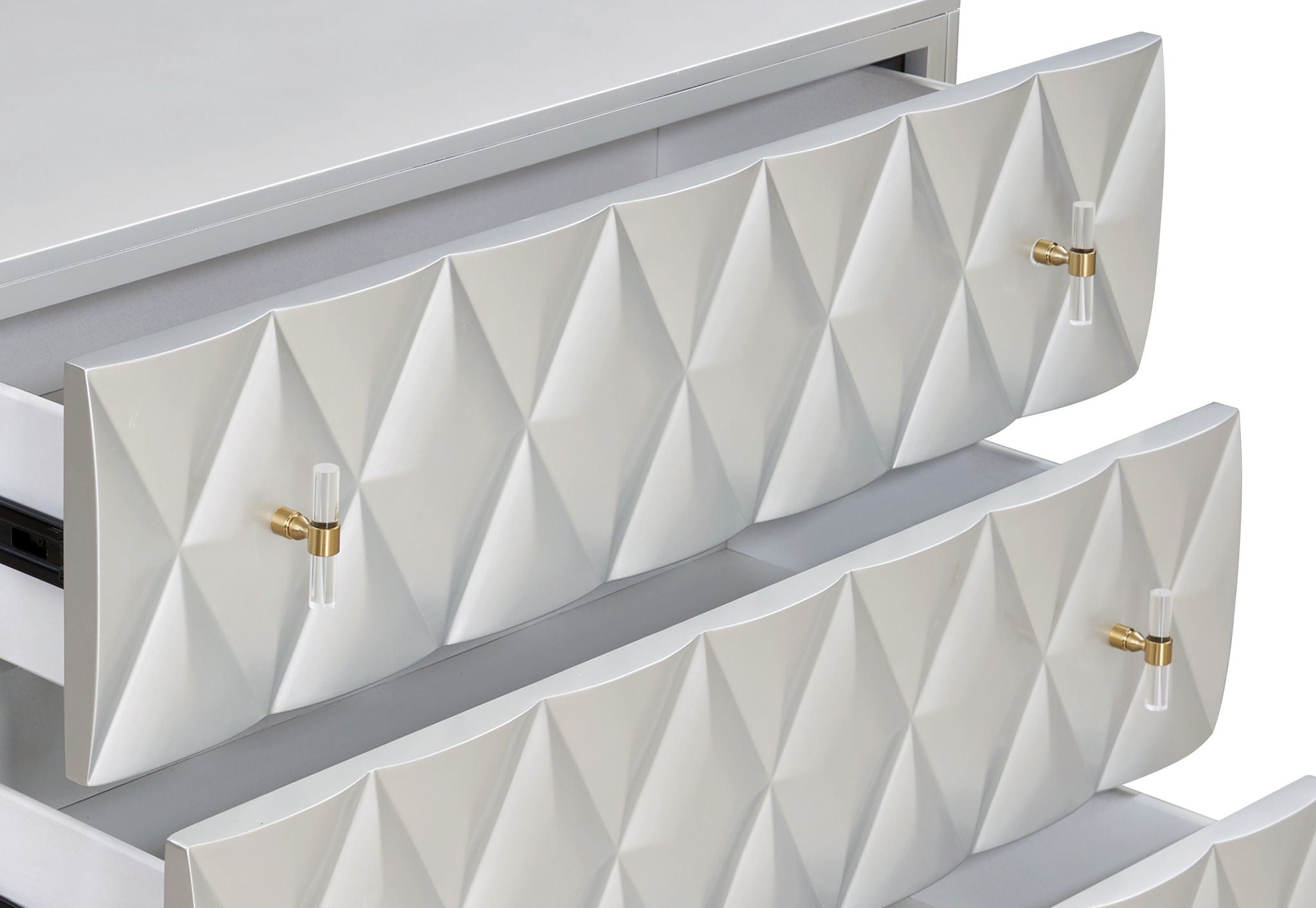 • 3D Diamond-Patterned Facade: The drawers boast a luxurious three-dimensional diamond pattern, paired with gold-tone hardware, offering a chic contrast against the silver finish.
