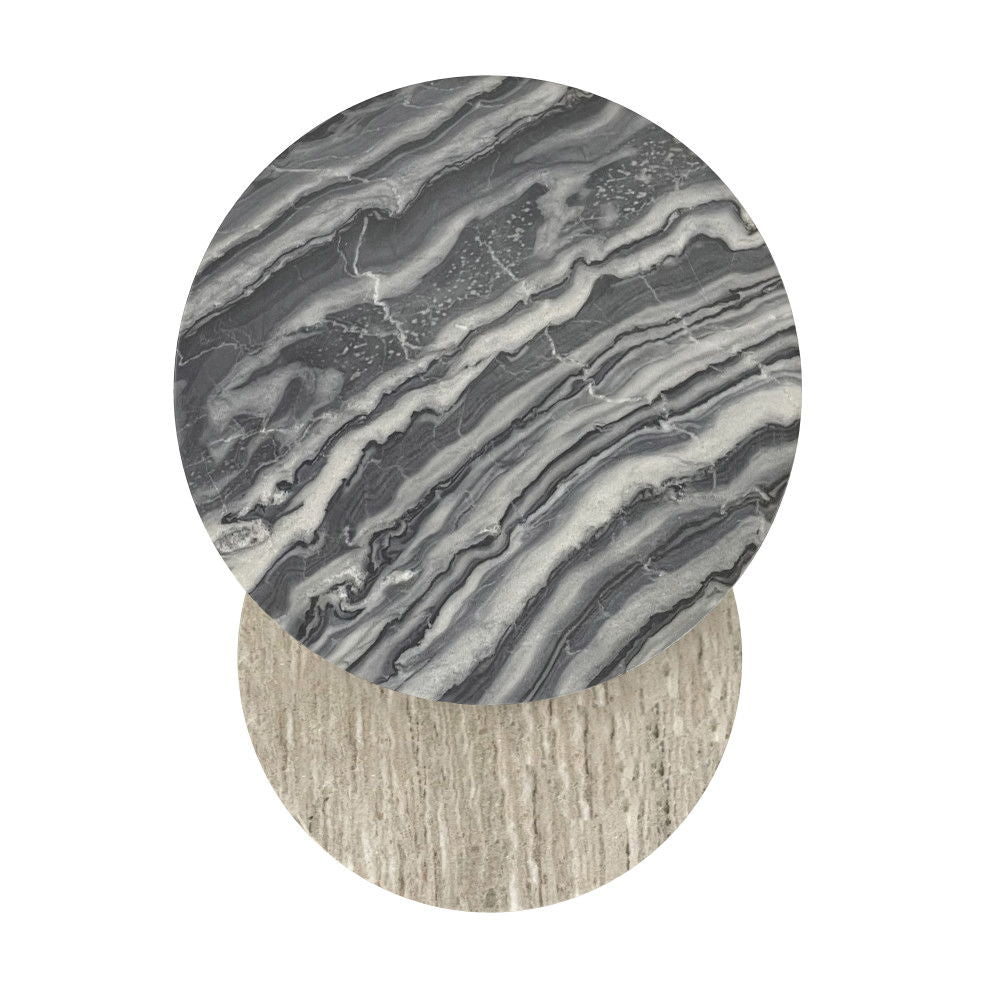 - Hand-finished metal base in Gold and two contrasting Marble tabletops, one in Grey, the other in Natural.