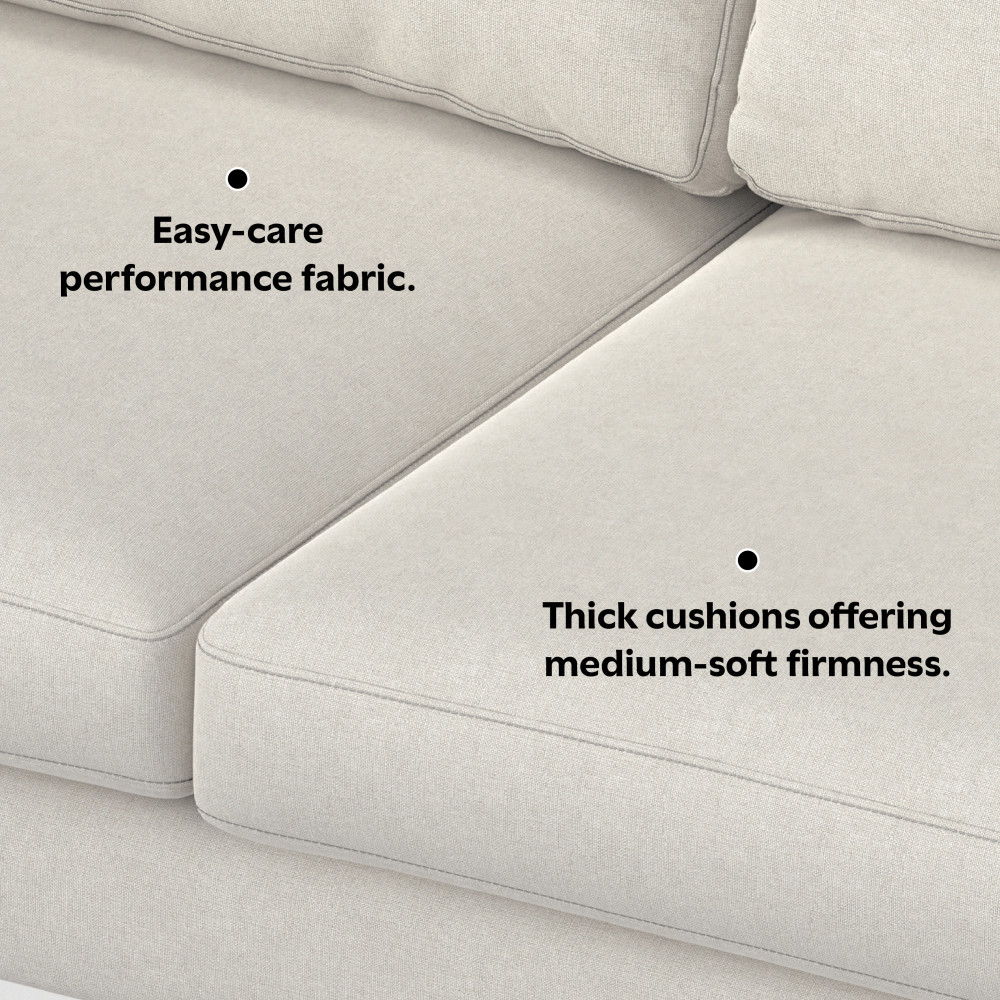 - The generously sized sofa for 3 features 2 wide seat cushions with high-density foam cores and feather/fiber toppers wrapped in high-quality, plus 2 thick back cushions 2 large throw pillows filled with feathers and fiber for a soft, comfortable feel.
