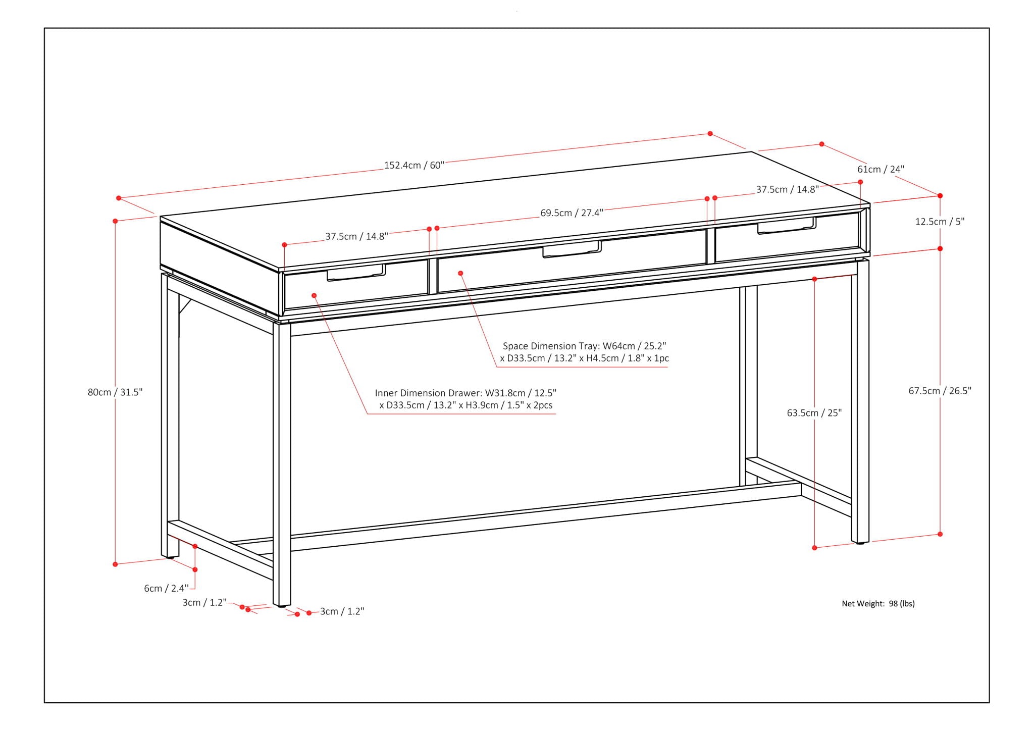 60.0"W x 24.0"D x 31.5"H - 98.1 lb
